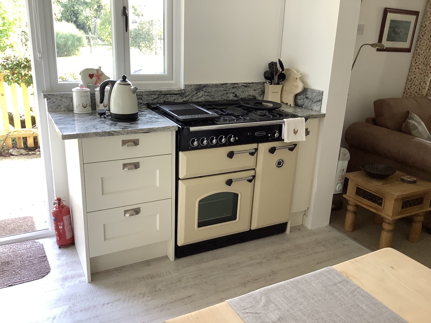 Die offene Küche sowie der Wohn- und Essbereich sind ein schöner Ort, um sich in einem modernen, warmen und überlegten Raum bequem zu entspannen. Es gibt einen Rangemaster-Herd mit Gasherd und elektrischen Öfen. Die Lounge bietet ein Ledersofa, von dem eines einen dritten Schlafbereich für eine 5. und / oder 6. Person schafft. An jedem Ende des Hauses befindet sich ein gut ausgestattetes Schlafzimmer mit Doppelbett, Kleiderschrank und Stauraum. Man führt direkt auf die Terrasse über Fenstertüren! Das Badezimmer mit Shabby Shabby Chic gefliesten Dusche, Waschbecken und w / c.