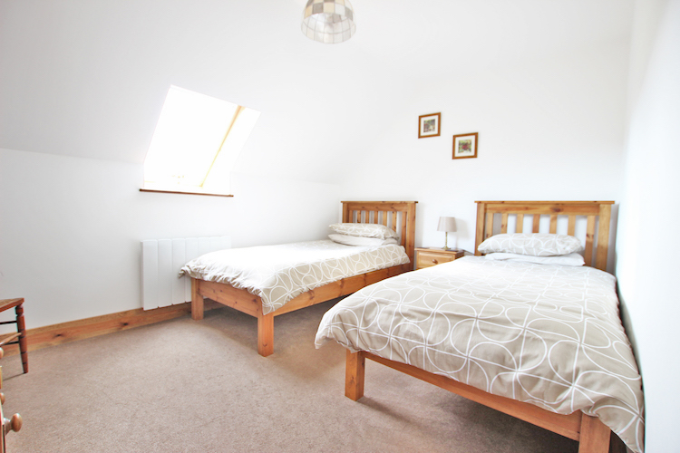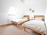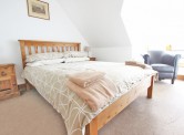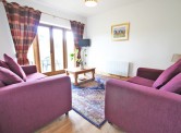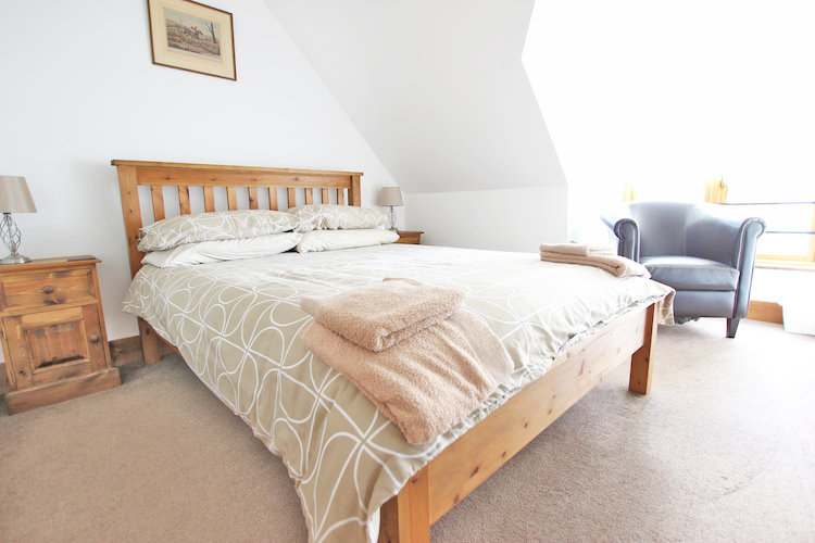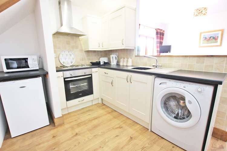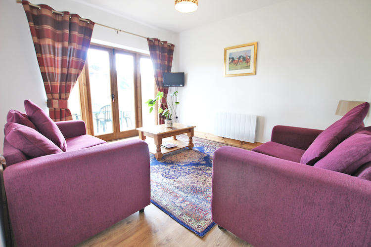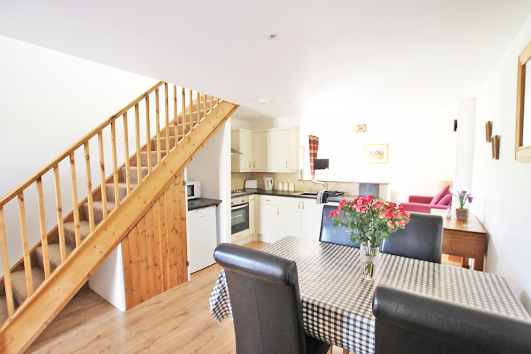Through the entrance you are greeted with an open plan kitchen, dining and lounge area. The kitchen comes equipped with cooking necessities and the lounge includes a flatscreen television with DVD and Freeview, double french doors lead out to a patio and garden area. On the first floor there is a full bathroom with WC, over-bath shower and basin as well as airing cupboard with plenty of hanging space. The master bedroom includes a double bed, armchair and bedside tables and the second twin bedroom has solid oak beds, a large wardrobe, bedside table and chair with views across the rear paddocks.